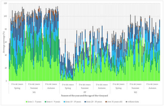 In the grassy inter-row (M1), there was an increase in coverage in the vineyards that were up to 4 years old, in both the perennial dicotyledon and perennial monocotyledon groups. The increase was no longer evident in older vineyards. The coverage of the group of annual dicotyledonous plants gradually decreased with the age of the vineyards, up to 6 years, and then the share of coverage stagnated. The coverage of the group of annual monocots was higher in vineyards older than 6 years, but only in the spring evaluation period; in the other evaluation periods, the coverage stagnated.