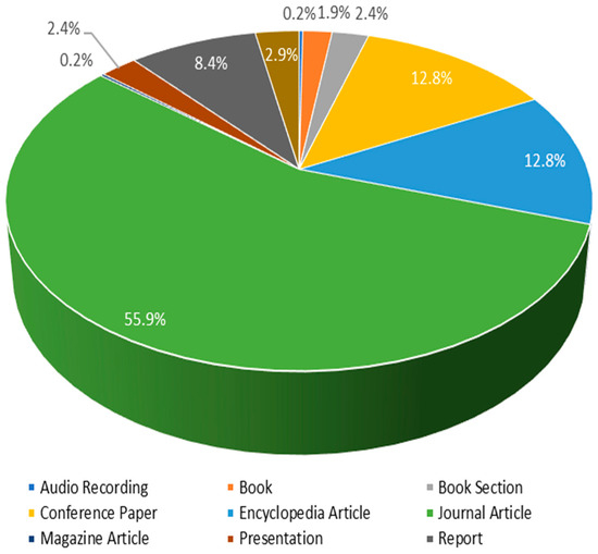 The reference search resulted in 415 non-redundant scientific works on agroforestry systems associated with food crops (Supplemental Table S1). They were collected from CAB Abstracts, Econlit, and Agricola databases, as well as from personal libraries. These references were saved in an online Zotero library. This library consists of references from books, book sections, conference papers, review papers (called encyclopedia), journal articles, presentations, reports, thesis, audio recordings, and magazine articles. The library counts 232 journal articles (55.9%) followed by 53 encyclopedia articles or review papers (12.8%), 53 conference papers (12.8%), 35 reports (8.4%), and the remaining references represent less than 5% (Figure 1). In order to reduce the bias related to the gray literature (reports, theses, etc.) mainly collected from Indonesian and Thai scientists, we focused further analyses on journal articles. Of the 232 journal articles, 141 papers were rubber studies used for further analysis (Supplemental Table S1). The gray literature was used in the discussion and prospects. The journal articles were used for the following analyses.