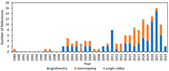 The number of RAS-related research studies has evolved dynamically, with an upward trend over the last 30 years (Figure 2). The first publication in this library was released in 1989. Only one journal article per year was published in 1989, 1996, and 1997. A significant increase was observed from 2000 to 2006 with about five references per year. The number of publications has increased again from 2014 to peak at 16 references in 2021. The slight decrease in 2022 could be an effect of the COVID-19 pandemic. Most of the references studied agroforestry (association during all the plantation cycle) and intercropping (association during the immature period of the plantation). Although twenty-four references were collected on jungle rubber, four journal articles were published on this topic.