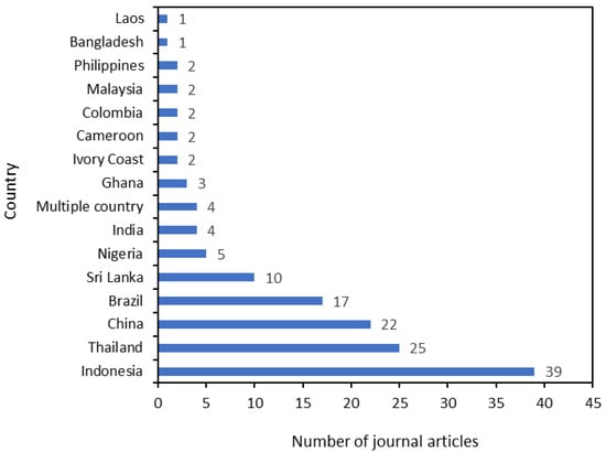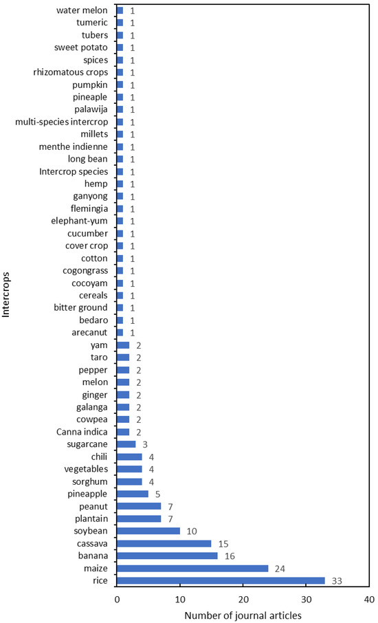 Countries with the highest number of journal articles on RASs were Indonesia (39), followed by Thailand (25), China (22), Brazil (17), and Sri Lanka (10) (Figure 3). Less than 6 journal articles were published in other countries, representing 24 papers, and 4 studies conducted in several countries. In order to better understand the studies conducted in these countries, an analysis of intercrop types was carried out.