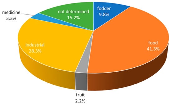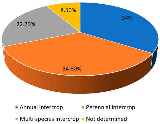 The usage of intercrop products is diverse, and was categorized as food for human beings, fodder for animals, industrial for transformation in factories, medicine for medical applications, and not determined when the papers did not clearly mention the usage of the products (Figure 6). Seventy-eight journal articles studied food crop for food production (41.3%), followed by 52 on industrial usage (28.8%), 18 journals on fodder (9.8%), 6 journals on medicine (3.3%), and 4 journal articles on fruit (2.2%). A similar proportion was also found for all references that studied food products then industrial products, except in books, which contain more studies on industrial crops (Supplemental Table S1).