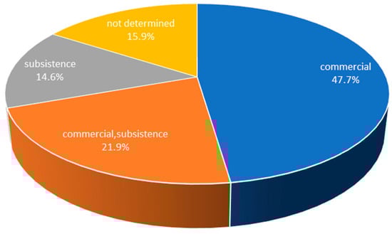 In order to understand if farmers use their products for self-consumption or for commercial activities, the library references were tagged with subsistence and commercial items, or both items. Intercrop products from agroforestry were firstly used for commercial activities (47.7% of journal articles) and then both commercial and subsistence (21.9%), and only 14.6% of the papers mentioned the usage of products for subsistence only (Figure 7).