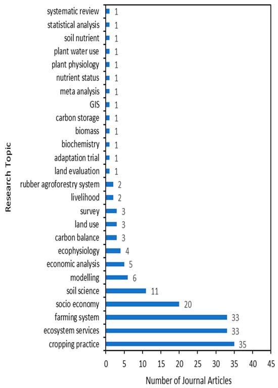 In an attempt to better describe the implemented studies, journal articles were tagged with 26 research topics (Figure 8). For some journal articles, it was difficult to detail the study, and some general topics have been mentioned, such as socio-economic, ecosystem services, etc. Farming systems, ecosystem services, and cropping practices represent the largest number of studies: 33, 33, and 35, respectively. Soil science and socio-economic studies were implemented in 11 and 20 journal articles, respectively. The other research topics were analyzed in only one to a maximum of six papers.