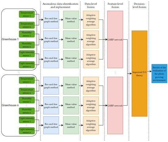 Sensors collecting similar environmental factors were homogeneous sensors that were fused by adaptive weighting [20]; sensors collecting different environmental factors were heterogeneous sensors [21], which were fused by the LMBP network prediction model and improved D-S theory. Data with large differences will reduce the accuracy of the three-level fusion, which should be checked by the box-and-line plot method first, and the outliers are replaced based on the mean value method. The block diagram of the fusion structure is shown in Figure 1.