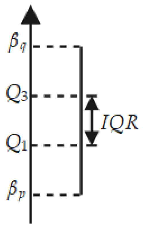 Arrange the n data points obtained from the same sensor in time series from smallest to largest to get [x1, x2,…, xn]. The box-and-line plot data division is shown in Figure 2, and the data confidence interval [βp, βq] is defined.
