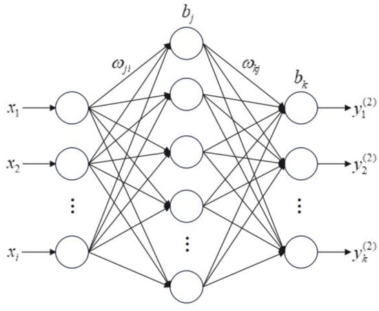 - Determine the transfer function and learning algorithm. Taking a single-layer neural network as an example, the transfer formula from the input layer to the hidden layer is as follows:In Equation (24), is the output of the i–th node of the hidden layer, and ωji is the transfer weight between the input layer and the hidden layer, if the propagation continues:In Equation (25), q is the number of nodes in the implicit layer. If is the output of the last layer, then the output yk is obtained from the 2-layer transfer of the input layer. The process of forward transfer introduces a nonlinear function f(z); f(z) is known as the activation function, and the commonly used Sigmoid function is the activation function:The most rapid descent method is commonly used to adjust the BP network weights: the model is made to be adjusted in reverse layer by layer along the network to minimize the loss function, and the weights are iteratively updated to make the network track the effective data effectively to approach the target output. In this modeling, firstly, a large amount of basic data is provided for the neural network to establish a collection of neural networks for data classification, and finally, the probability under different conditions is obtained through the Softmax regression model [28].