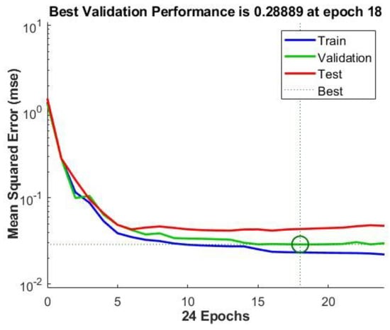 The hidden layer is called the Sigmoid function, and the output layer is called the Softmax function. The trainlm function of the Levenberg–Marquardt algorithm is used as the training function [35] with 1000 iterations, an expected error of 1 × 10−6, and a learning rate of 0.01.