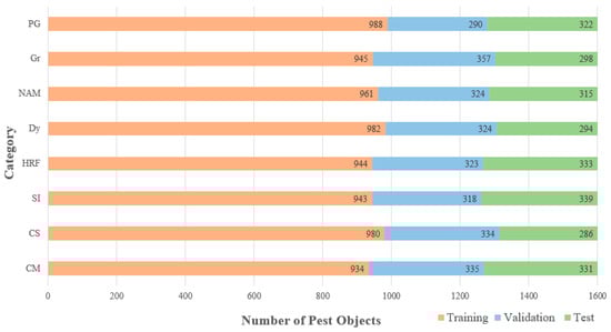 During the image data preprocessing stage, we wanted to double the size of the image dataset to enhance data volume and improve the model’s generalization performance. For each image, we selected one of the operations (flipping or rotating) with a certain probability to augment the image. The final augmented pest dataset contained 5000 images. Following a ratio of 6:2:2, 3000 images were allocated for the training set, 1000 images for the validation set, and 1000 images for the test set. Each image may contain multiple pest objects, so we tried to ensure that the distribution of object numbers for each category was relatively uniform across the different datasets during the random split. The distribution of the number of pest objects for each category in the different sets is shown in Figure 2.