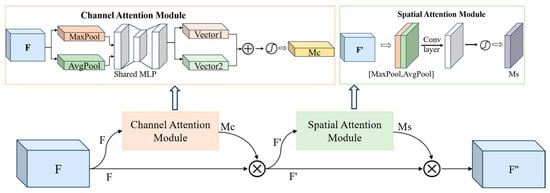 where and represent the channel and spatial attention modules, respectively; and are the max pooling and average pooling calculations, respectively; and represent the calculated outputs of the max pooling and average pooling, respectively; and and are the weights of MLP. ⊗ indicates element-wise multiplication, and is the Sigmoid activation function. is a convolutional kernel with a stride of 7 × 7.