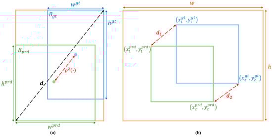 After evaluating commonly used IoU loss functions, including CIoU, Siliang M [30] proposed a new bounding box similarity comparison metric, MPDIoU, based on Minimum Points Distance. MPDIoU aimed to better train the model by minimizing the distance between the upper-left and lower-right points of the predicted bounding box and the ground truth bounding box. The schematic diagram of MPDIoU is shown in Figure 7b. It can fully exploit the geometric features between bounding boxes and include all relevant factors considered in existing bounding box loss measures, such as overlapping or non-overlapping areas, center point distance, width, and height deviations, while simplifying the calculation process and improving the model performance. MPDIoU is calculated as follows: