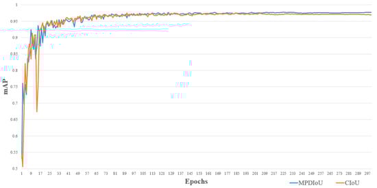 where and represent the width and height of the input image. are the coordinates of the top-left and bottom-right corners of the ground truth bounding box, while are the coordinates of the top-left and bottom-right corners of the predicted bounding box. In Equation (9), represents the distance between the top-left corners of the two bounding boxes, as indicated by the red dashed line in Figure 7b. Similarly, represents the distance between the bottom-right corners of the two bounding boxes. Finally, combining and with and allows for a more comprehensive quantification of the differences between the two bounding boxes. A predicted bounding box that is closer to the ground truth bounding box signifies a more accurate prediction. Hence, during training, MPDIoU compelled each predicted bounding box of the model to approach the ground truth bounding box, thereby enhancing the detection performance of the model. In general, MPDIoU could simplify the similarity comparison between two bounding boxes and achieve better adaptation to bounding box regression with simpler operations. In order to verify the effectiveness of MPDIoU on the dataset used in this paper, we trained the YOLOv8 model on the dataset using both the original CIoU and MPDIoU loss measures and compared the changes in mAP during the training process. Figure 8 illustrates the mAP changes during training. It is observed that the mAP of the original CIoU exhibits large fluctuations in the initial stage, whereas the mAP of MPDIoU converges more steadily during the training process, eventually reaching 97.67%, surpassing CIoU. This indicates that the MPDIoU loss metric demonstrates better stability, facilitating faster model convergence and improved detection performance.