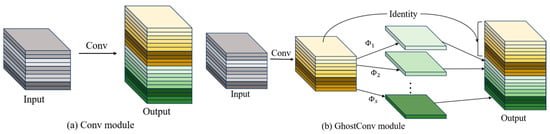 Figure 9a depicts a schematic diagram of the traditional convolution operation. Its calculation parameters are composed of the product of the input data and the value of each dimension in the filter. This value is usually large, and similar redundant feature maps exist in the convolved output data. The output data of a convolution operation might contain parts that are similar to each other, and these similar parts can be grouped together. One feature map in each group is selected as the intrinsic map, and other feature maps can be regarded as redundant parts, termed ghosts of the feature map. Since the features of intrinsic and ghost maps are largely similar, Ghost convolution uses cheaper operations to generate these redundant parts and keeps the spatial size of the output feature map consistent, thereby reducing the floating-point operations and parameters used to generate these redundant feature maps. The above process can be expressed by Equation (12):