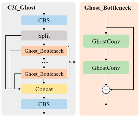 This article employed the lightweight GhostConv module to replace part of the original Conv module for extracting features of pest objects with fewer parameters while maintaining considerable accuracy. We improved the original Conv module in the C2f module within the model with the GhostConv module, termed the C2f_Ghost module, and replaced some of the original C2f modules in the model. The structure of the improved C2f_Ghost module is depicted in Figure 10.
