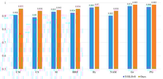 The ablation experiment results in Table 1 show the details of the performance improvement of the proposed method over the baseline algorithm; ✓ represents the use of the corresponding improvement method. Among them, the addition of the M-CBAM module had the greatest improvement in the detection performance of the baseline model. It improved the mAP and F1-score by 1.8% and 1.2%, respectively, over the baseline model. Furthermore, the additional model calculation parameters only increased by 0.01 MB, which could be ignored. Additionally, adding the Ghost module to the model reduced model parameters from 3.01 M to 2.14 M, a reduction of approximately 29%, while the corresponding detection performance only showed a slight decrease. This showed that the Ghost module could effectively reduce model parameters and computational costs without affecting detection performance. Subsequently, the performance of the model that combined the two improved methods also showed a corresponding improvement. The model combined with the M-CBAM module and MPDIoU method performed best on the test set, with the mAP reaching up to 96%, 2.8% higher than the baseline model, and the F1-score reaching 94.9%, 2% higher than the baseline model. Finally, due to the parameter reduction using the Ghost module, the algorithm slightly reduced the mAP, but it still reached up to 95.8%, which is 2.6% higher than the baseline model. The F1-score was 1.7% higher than the baseline model, and the model parameters were 29% lower than the baseline model. Therefore, the ablation experiments verified the effectiveness of the three proposed improvement methods for baseline model accuracy and lightweight improvement.