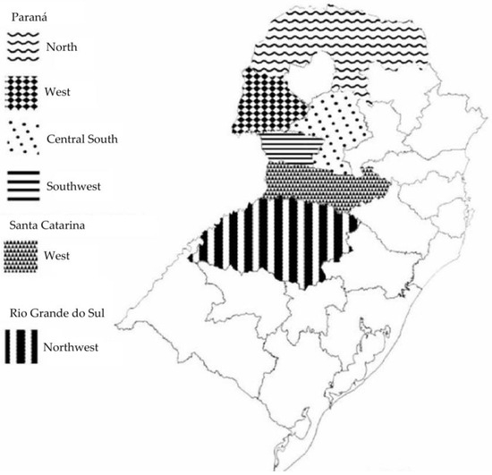 In total, 517 reports from the states of Paraná, Santa Catarina, and Rio Grande do Sul were obtained and divided into mesoregions, with 62 reports in the Central South mesoregion, 14 in the North mesoregion, 65 in the West mesoregion, 139 in the Southwest mesoregion of Paraná, 225 in the West mesoregion of Santa Catarina, and 12 in the Northwest mesoregion of Rio Grande do Sul.