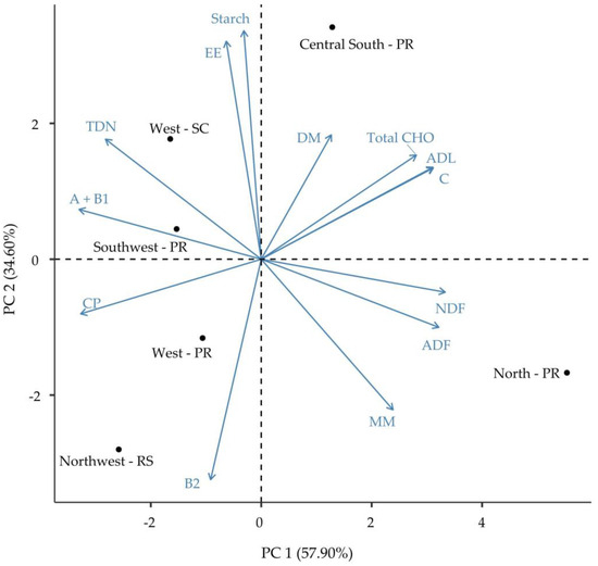 The first two main components, PC 1 (57.90%) and PC 2 (34.60%), explained 92.50% of the total variation in the data, which allowed for a safe interpretation of the variables and mesoregions studied. The contribution of the analyzed variables to the formation of principal components is defined by the length of the arrows and their proximity to the axis. The variables NDF and ADF had a greater influence on the formation of PC 1, whereas fractions A + B1 and CP had less influence. The formation of PC 2 had a greater influence on EE and starch and a lesser influence on the B2 fraction.