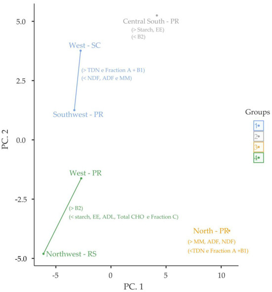 The silages from the West-SC and Southwest-PR mesoregions showed similarities, with the silages having higher levels of TDNs and fraction A + B1 and lower levels of NDF, ADF, and MM. The silages from West-PR and Northwest-RS also showed similarities, having a higher content of the B2 fraction and lower levels of starch, EE, ADL, total CHO, and fraction C. Silages from the North-PR and Central South-PR mesoregions differed from the others, establishing separate groups.
