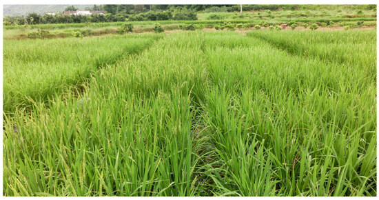 Rice plants grown in the experimental plots.