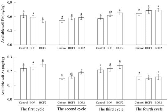 Available soil Pb and As in field experiments with and without bioorganic fertilizer (mean ± SE, n = 4). BOF1: bioorganic fertilizer (0.45 kg/m2), BOF2: bioorganic fertilizer (0.9 kg/m2). Different letters within the same parameter and the same cycle indicate a significant difference (p < 0.05) between the treatments.