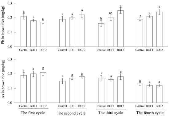 Concentrations of Pb and As in brown rice in paddy field experiments with and without bioorganic fertilizer (mean ± SE, n = 4). BOF1: bioorganic fertilizer (0.45 kg/m2), BOF2: bioorganic fertilizer (0.9 kg/m2). Different letters within the same parameter and the same cycle indicate a significant difference (p < 0.05) between the treatments.