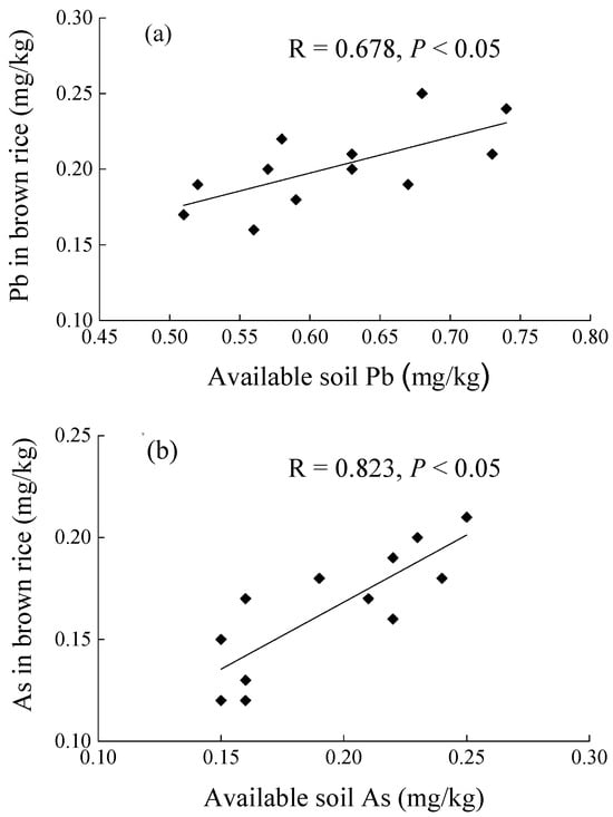 Correlations between concentrations of Pb and As in brown rice and concentrations of available soil Pb and As in paddy field experiments, respectively (n = 12).