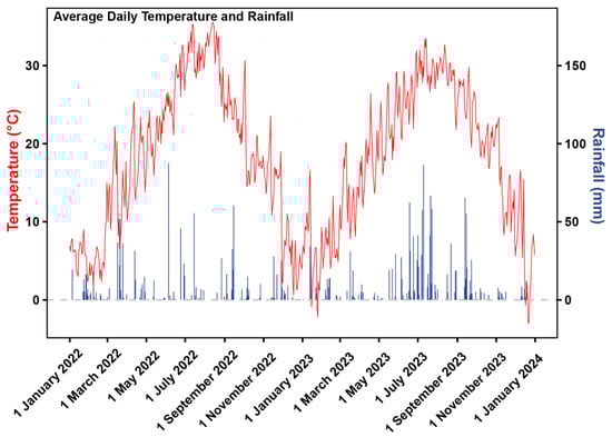 Meteorological conditions in 2022 and 2023 are generally similar, with no extreme meteorological events, and average daily temperatures in 2022 were slightly higher than those in 2023, while rainfall in 2023 was slightly higher than that in 2022 (Figure 1).