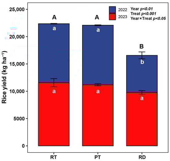 Analysis of variance revealed that the rice yields of RT and PT were significantly higher than those of RD in 2022, with an average rice yield of 10,845 kg ha–1 for RT and PT, which was 1.6 times that of RD (Figure 2). There were no significant differences in rice yield between the different treatments in 2023, with an average yield of 10,850 kg ha–1 (Figure 2).