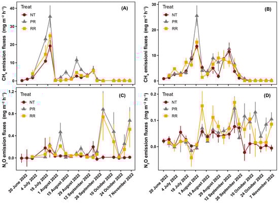 Seasonal dynamics of CH4 (A,B) and N2O (C,D) emission fluxes under different soil tillage and cultivation practice in 2022 and 2023. RR and PR represent rotary tillage and plowing with rice transplanting in rice season, respectively. NT represents no tillage and direct seedling of rice. Vertical bars indicate standard errors of four replicates.
