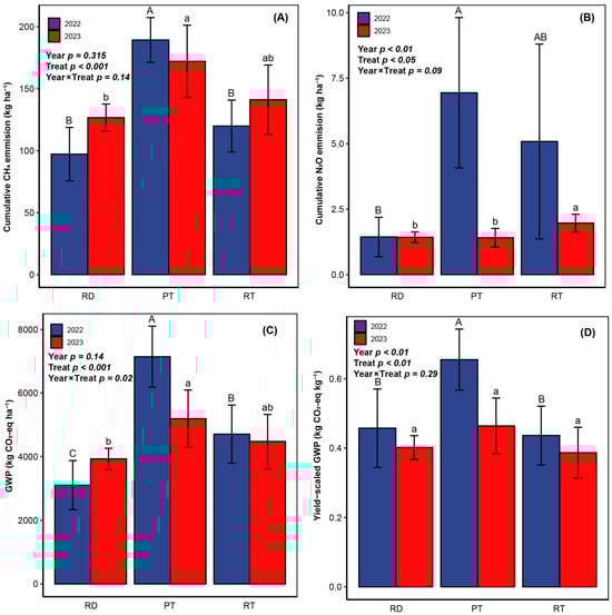 Impacts of soil tillage and cultivation practices on CH4 (A), N2O (B) cumulative emissions, global warming potential (GWP) (C) and yield-scaled GWPs (D) for 2022 and 2023. RR and PR represent rotary tillage and plowing with rice transplanting in rice season, respectively. NT represents no tillage with direct seedling of rice. Vertical bars indicate standard errors of four replicates. Different uppercase and lowercase letters on bars represent significant differences between treatments at 0.05 levels (Tukey’s HSD test) in 2022 and 2023, respectively.