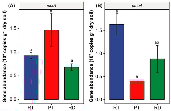 Fluorescence-based quantitative PCR (qPCR) data indicated that although there was no significant difference in the copies of mcrA gene between treatments, the copies of the mcrA gene of PT were still much higher than those in RT and RD, with increases of 58.5% and 114.5%, respectively. The copies of pmoA gene differed significantly between treatments, and RT had 1.85- and 4.05-times copies of pmoA gene than RD and PT, respectively (Figure 5A,B).