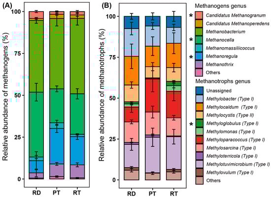 Community compositions of methanogenic (A) and methanotrophic (B) microbes of genus levels in 0–20 cm topsoil at tillering stage in 2023. Groups with <1% relative abundance were merged into the “Others” taxa. Asterisks represent significant differences of relative abundance among treatments according to Kruskal–Wallis test, with a significance level of 0.05. Vertical bars indicate standard errors of three replicates.