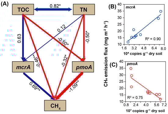 The structural equation models (SEM) based on the relationships and interactions among soil total organic carbon (TOC), soil total nitrogen (TN), methanogen abundance (mcrA), methanotroph abundance (pmoA), and CH4 emission fluxes at tillering stage in 2023 (A). The numbers listed on the arrows are standardized parameter estimates (* p < 0.05, ** p < 0.01). The size of each path coefficient is represented by the thickness of the arrow, where red represents a negative effect and blue represents a positive effect. The assessment parameters of SEM are listed as follows: Chisq = 0.723, df = 1.000, p value = 0.395, GFI = 0.999, CFI = 1.000, and RMSEA = 0.000. The linear model represents the relationships between CH4 emission flux and methanogens (B) and methanotrophs (C), respectively.