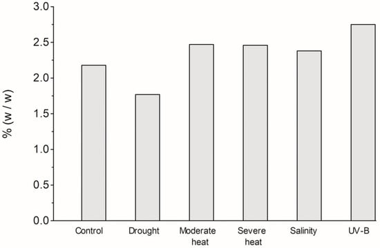Figure 1 presents the yields of L. viridis EO, expressed as the weight of EO in relation to the weight of the starting plant material. The extraction yield of the control plants was higher compared to that obtained in other studies with L. viridis [11,20,28], in vitro shoot cultures, or micropropagated plants [28]. When comparing the results of the various environmental treatments, it was found that the highest yield was obtained in the UV-B treatment (2.75% w/w), followed by moderate and severe heat treatments (10% less) and salinity treatment (13% less).
