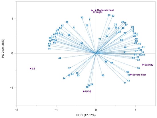 The first two PCs (PC1 and PC2) were found to account for 72.05% of the total variation within the dataset. The results indicate that moderate heat and drought exert a comparable influence on EOs’ composition, with the content of borneol, dehydro-1,8-cineole, myrtenyl acetate, eucarvone, 2-phenyl ethyl propanoate, and nerol acetate being particularly noteworthy. Furthermore, drought and moderate heat also exerted a significant influence on the monoterpene hydrocarbons (α-pinene, camphene, sabinene, β-pinene, δ-3-carene, p-cymene, γ-terpinene, tricyclene, myrcene, and p-cymenene), all of which were positioned at positive PC2 values (third and fourth quadrants). Similarly, salinity and severe heat (located at the first quadrant, positive PC1 and negative PC2) demonstrated a comparable impact on the EOs’ profiles, with the most representative compounds belonging to the oxygenated monoterpene family (pinocarvone, verbenone, terpinene-4-ol, cis-chrysanthenol, α-campholenal, 6-camphenol, trans-linalool oxide, (-)-carvone, cis-p-mentha-1(7),8-diene-2-ol, p-mentha-1,4-dien-7-ol, α-pinene oxide, p-cymen-7-ol, trans-carvone oxide, and p-mentha-1,8-dien-7-ol), including the two most abundant compounds (1,8-cineole and camphor). Conversely, control and UV-B, despite being in the same quadrant, exhibited a notable disparity in their chemical response. Abiotic factors exhibited a minimal impact on the majority of the sesquiterpenes (both hydrocarbons and oxygenated compounds), which were primarily situated in the third quadrant (negative PC1; positive PC2). UV-B was the treatment that exerted the least influence on the chemical profile of EO L. viridis.