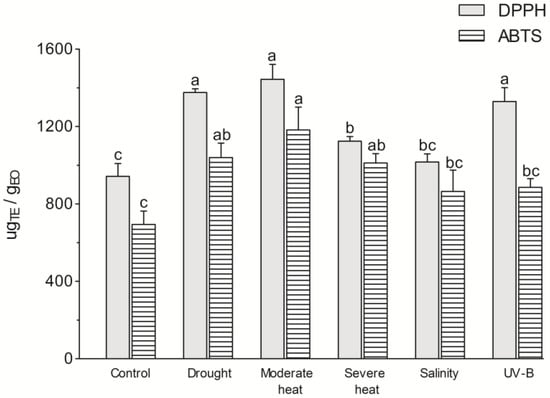 Overall, EOs from L. viridis plants exposed to abiotic factors exhibited higher antioxidant potential than the EO from control plants (Figure 3). This is not surprising since EOs are rich in compounds with antioxidant potential, which play an important role in combating abiotic stress in plants. The highest results in both DPPH (1444.37 ± 77.34 μgTE/gEO) and ABTS (1181.96 ± 118.86 μgTE/gEO) assays were observed in the EO from plants subjected to moderate heat, with a 41 and 34% increase in the capacity to scavenge ABTS and DPPH free radicals, respectively, compared to the control. Furthermore, drought, severe heat, and UV-B radiation also enhanced the antioxidant capacity of the EO.