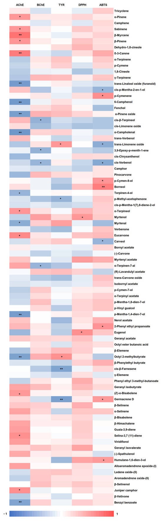 Heatmap representing the Pearson’s correlation coefficients between the 82 compounds identified in the Lavandula viridis L’Hér essential oils and the inhibition of three enzymes involved in neurodegenerative diseases (AChE, BChE, and Tyr), as well as antioxidant activity (DPPH and ABTS). Correlation is significant at p ≤ 0.01 (**) and p ≤ 0.05 (*).