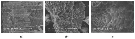 SEM images of biochar materials. (a) Corn straw biochar; (b) wheat straw biochar; (c) rice straw biochar.