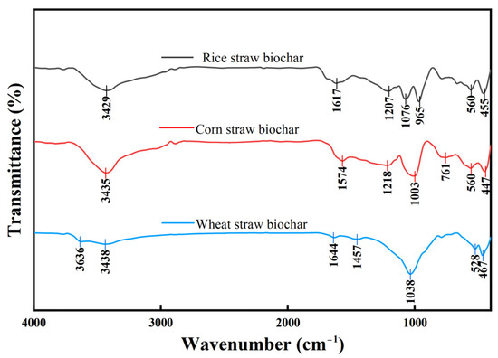 The functional groups of various straw biochar materials were characterized using an IRTracer 100 Fourier Transform Infrared Spectroscopy (FTIR) instrument (Shimadzu, Kyoto, Japan). The dried biochar samples were ground into powder, with 1–2 mg of each sample weighed out and uniformly mixed with KBr at a mass ratio of 1:100. The KBr was ground to a particle size of 200 mesh and dried for 1 h at 60 °C. The mixed powder was then placed into a mold, leveled, and pressed into circular discs using a pellet press. The discs were carefully removed and subjected to infrared spectroscopy. The scanning range was set from 4000 to 400 cm−1 with a resolution of 0.1 cm−1.