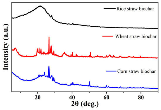 Table 1 presents the pore parameters of different biochar materials. There were significant differences in terms of specific surface area, pore volume, and pore diameter among the three types of biochar. Specifically, the biochar derived from corn straw had the largest specific surface area at 20.087 m2/g and the smallest average pore diameter at 4.565 nm. In contrast, the biochar derived from rice straw had the smallest specific surface area at 1.042 m2/g, and the largest average pore diameter at 19.670 nm. This might be due to variations in the inherent composition or content of different straw biomass, whereby substances containing hydroxyl (-OH) or carboxylic C=O groups decompose and are lost successively during the carbonization process, with stable components such as lignin (C=C and O–H) ultimately being retained. This leads to differences in the morphology, structure, and surface properties of the resulting straw biochars [27].