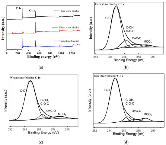 XPS full spectra and C1s narrow spectra of different biochar materials. (a) XPS full spectra; (b) C1s narrow spectra of corn straw biochar; (c) C1s narrow spectra of wheat straw biochar; (d) C1s narrow spectra of rice straw biochar.