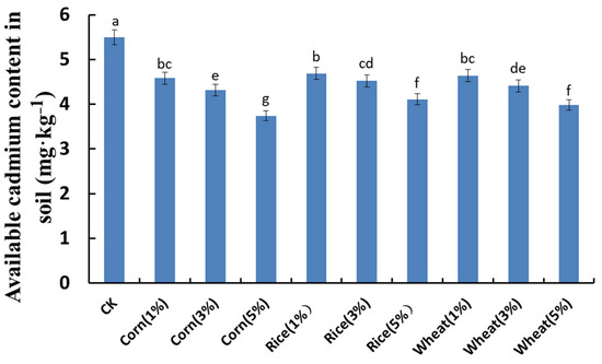 Effects of different biochar addition levels on the available Cd in Cd−contaminated soil. Note: different lowercase letters following the data in the same column indicate significant differences (p < 0.05), N = 3.