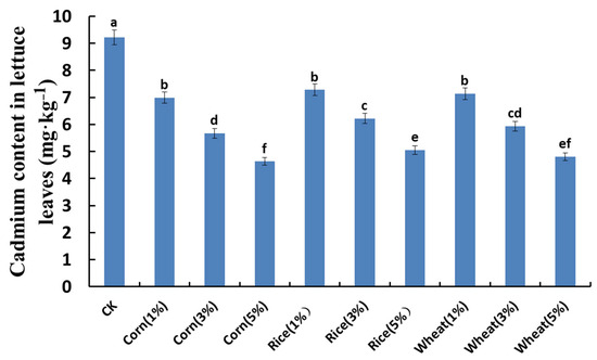 Effects of different biochar addition levels on the Cd content in mature lettuce leaves under Cd contamination conditions. Note: different lowercase letters following the data in the same column indicate significant differences (p < 0.05), N = 3.