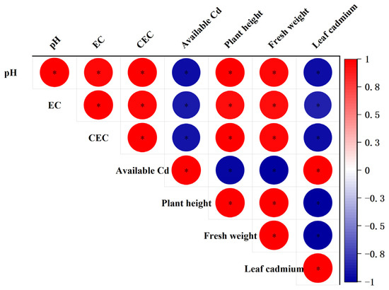Correlation analysis between soil properties and lettuce plant height, fresh weight, and leaf Cd content. Note: * indicates significant correlation at the 0.05 level.