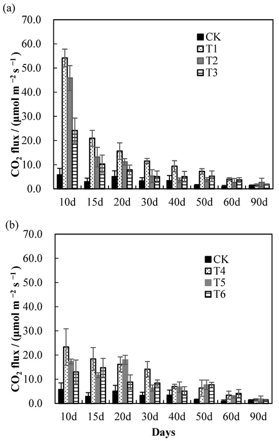 Furthermore, the addition of buried straw was found to increase CO2 efflux. The highest CO2 efflux value was observed in treatments with the highest amounts of buried straw (7.5 kg m−2) under 20 or 30 cm soil layers. Initially, the CO2 efflux of T3 (burial depth: 20 cm, straw amount: 7.5 kg m−2) and T6 (burial depth: 30 cm, straw amount: 7.5 kg m−2) was 54.2 and 23.3 μmol m−2 s−1, respectively, which was 8.4 and 3.2 times higher compared to CK. In contrast, SBR treatments with a straw burial depth of 30 cm exhibited a lower CO2 efflux compared to those with a burial depth of 20 cm and the same amount of buried straw. Specifically, CO2 efflux values were 90% higher in T1 than in T4, 160% higher in T2 than in T5, and 140% higher in T3 than in T6 for straw application amounts of 4.5, 6, and 7.5 kg m−2, respectively.