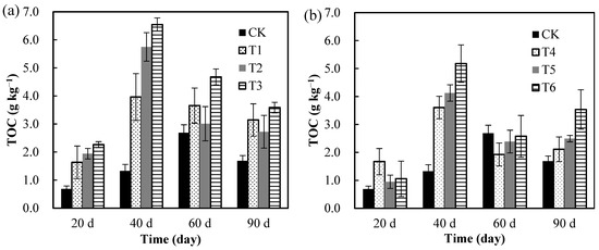 Effects of different treatments (a) burial depth of 20 cm (b) burial depth of 30 cm of buried straw bioreactor (SBR) treatments on TOC content.