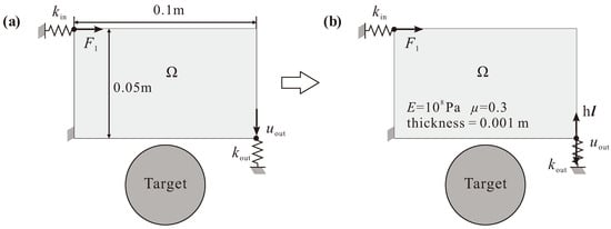 (a) The design domain and boundary condition for the flexible finger design considering contact behavior. (b) The load case when an additional external force, , is applied. The solution is obtained for sensitivity analysis.