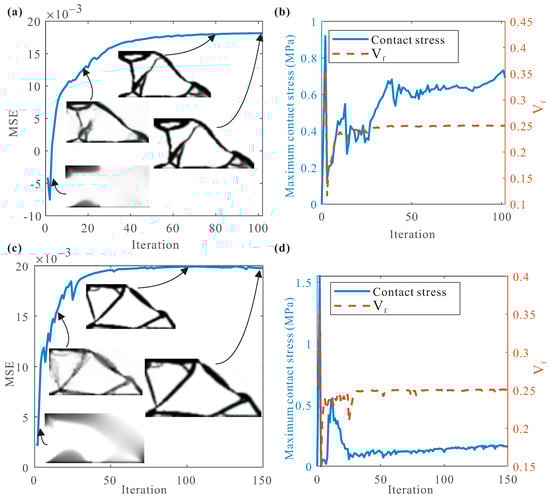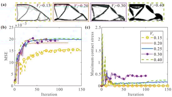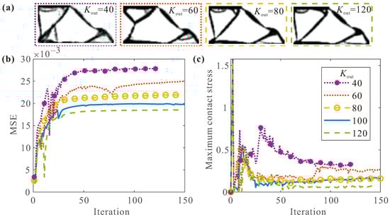 (a) Final topologies for different ; The convergence histories of (b) MSE and (c) maximum contact stress for different .