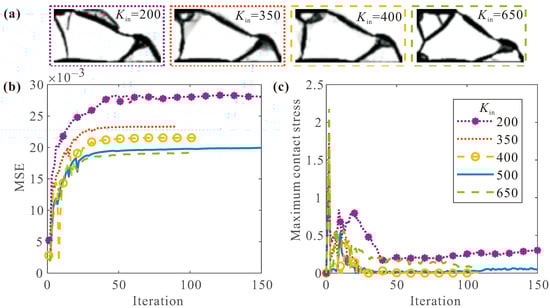 (a) Final topologies for different ; the convergence histories of (b) MSE and (c) maximum contact stress for different .