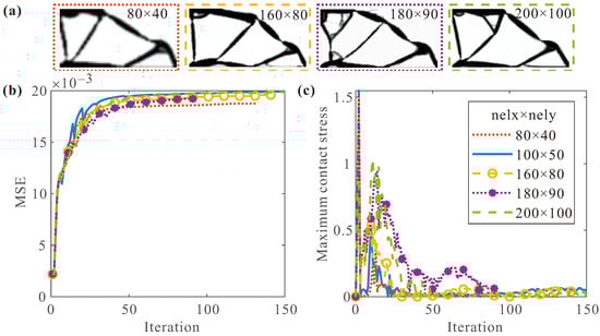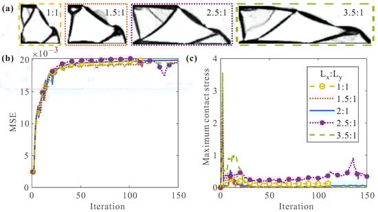 Then, the design domain size changes in the range of , while the N/m, N/m, and . A series of topology optimizations were performed for different . Figure 7 shows some topology optimization results, including the convergence history and final topologies for 1:1, 1.5:1, 2.5:1 and 3.5:1. As can be seen from all final topologies in Figure 7a, different design domain sizes () change the overall structure of the final topology. According to the convergence histories, different shows similar MSE, i.e., there is no obvious relationship between and the flexibility of the final topology in this design problem. However, both smaller and larger will make the contact stress of the final topology larger. Therefore, is a more appropriate choice.