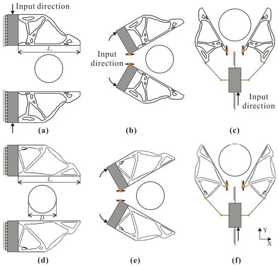- Huang, J.; Wei, Z.; Cui, Y.; Liu, J. Clamping force manipulation in 2D compliant gripper topology optimization under frictionless contact. Struct. Multidiscip. Optim. 2023, 66, 164. [Google Scholar] [CrossRef]